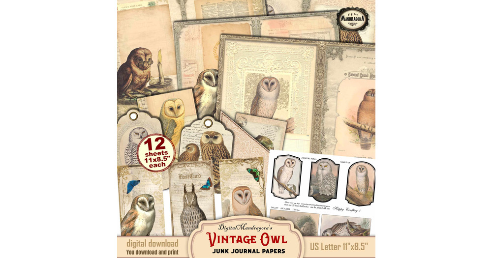 Vintage Owl Junk Journal Papers: Collage Pages, Tags (Digital Download)