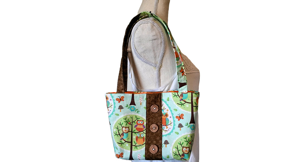 Little Owls Tote Bag with Front and Back Vertical Brown Band, 10 x 7.5" with 3" Depth.  To