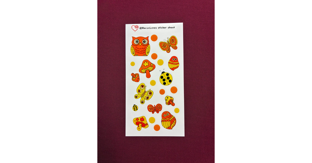 RecyLoves Sticker Sheet / Orange and Yellow Owls and Mushrooms / Groovy