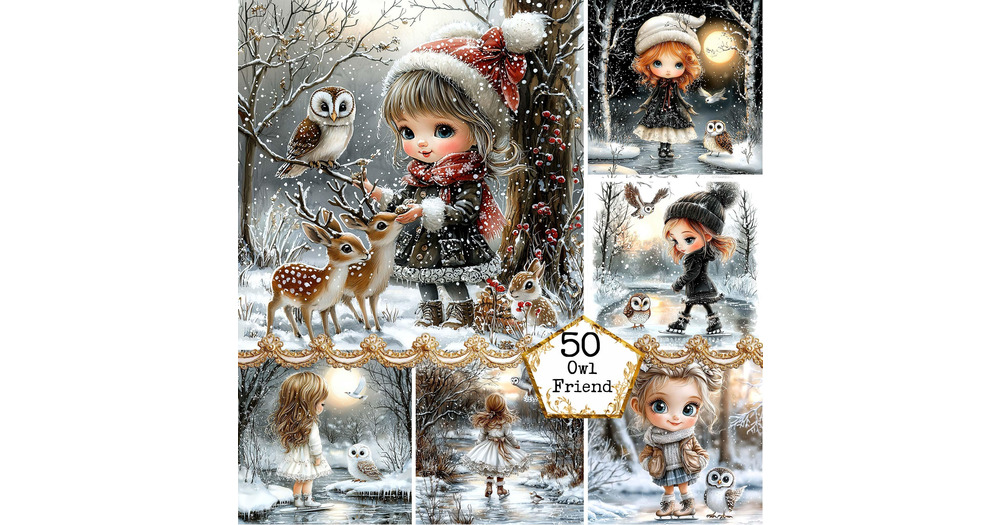 JPEG Girl and Owl Illustration Bundle Magical Forest Fairytale Art Winter Graphics Instant Download