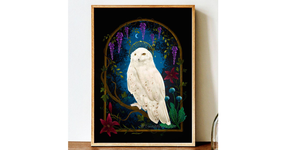 Snowy Owl Art Print: Magical Cottagecore Garden, Woodland Animal