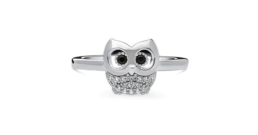 OWL Ring, Black & White Round Moissanite Diamond Ring, Mini Owl Bird Inspired Ring, Delicate Rin