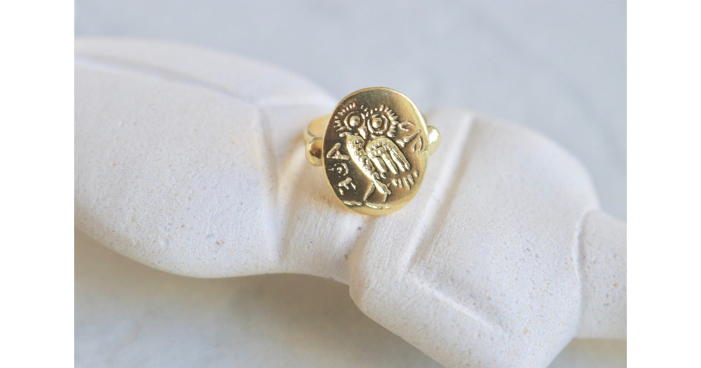Vermeil Ancient Greek OWL OF ATHENA Coin Signet Ring - Made in Greece