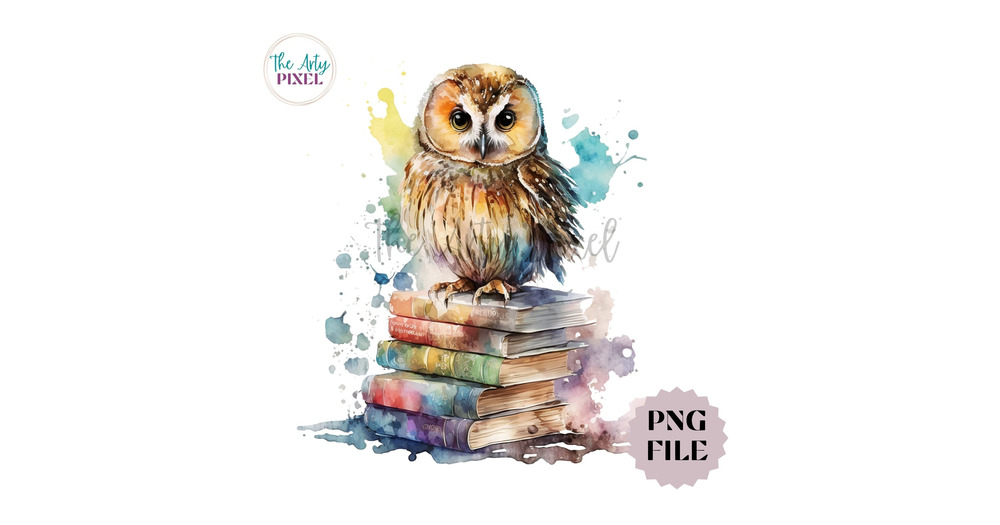 Pretty Owl Watercolor Clipart, Owl With Vintage Books Sublimation Design, Whimsical Clipart, Commerc