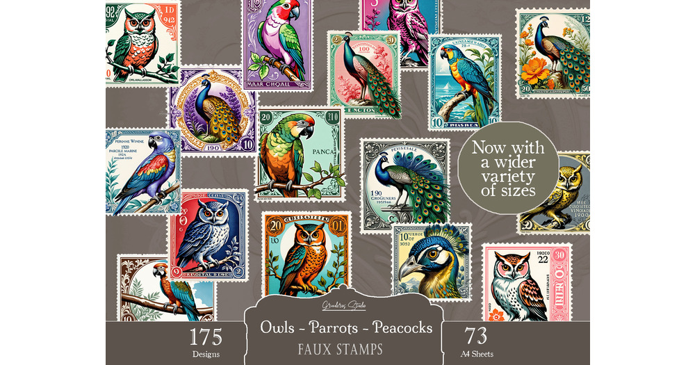 Printable Fake Stamps, Owl Stamps, Parrot Stamps, Peacock Stamps, Junk Journal, Ephemera, Faux Stamp