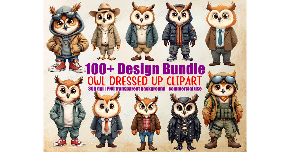 Owl Dressed Up Outfits Clipart Cartoon PNG Bundle Printable Nursery Animal Clipart Digital Download