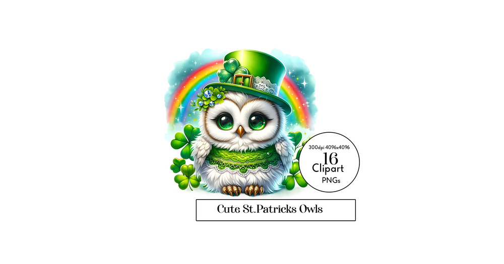 Adorable St. Patrick's Day Owls: 16 PNGs Watercolor Clipart for Festive Holiday Designs, cards,