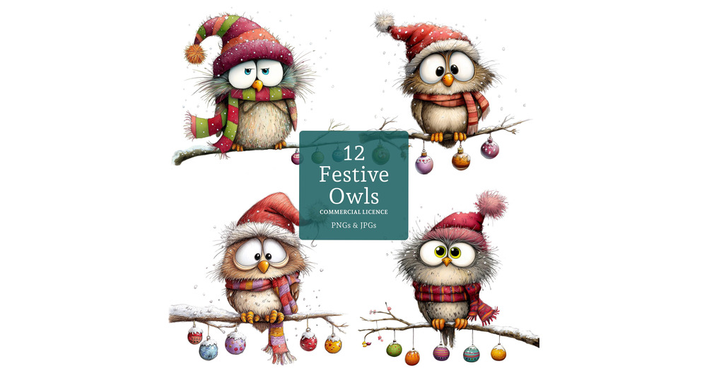 Quirky Christmas Owl Clipart, 12 High Quality Watercolour PNGs/JPGs Santa Hat Owl Clipart, Card Maki