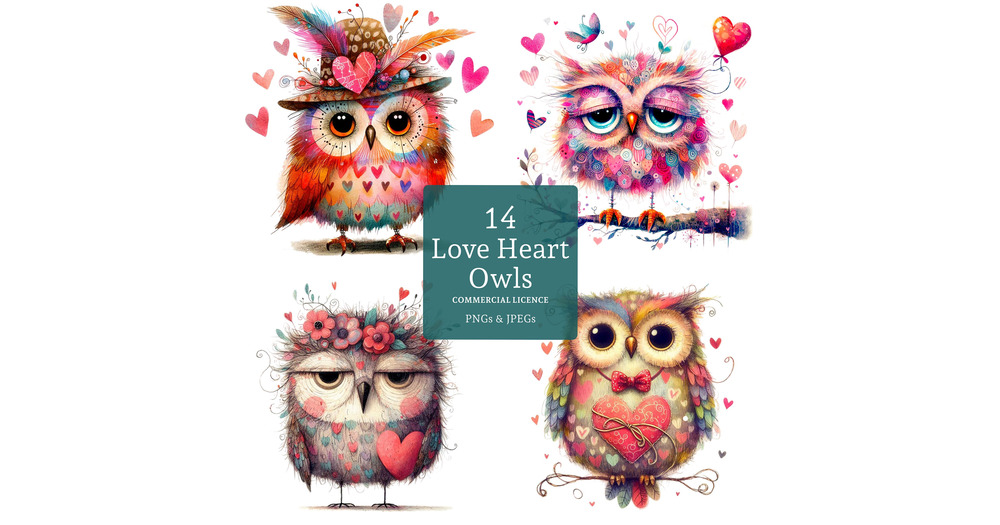 Love Heart Owl Clipart, 14 High Quality PNGs/JPGs, Valentine Birds, Paper & Digital Crafting, Wh