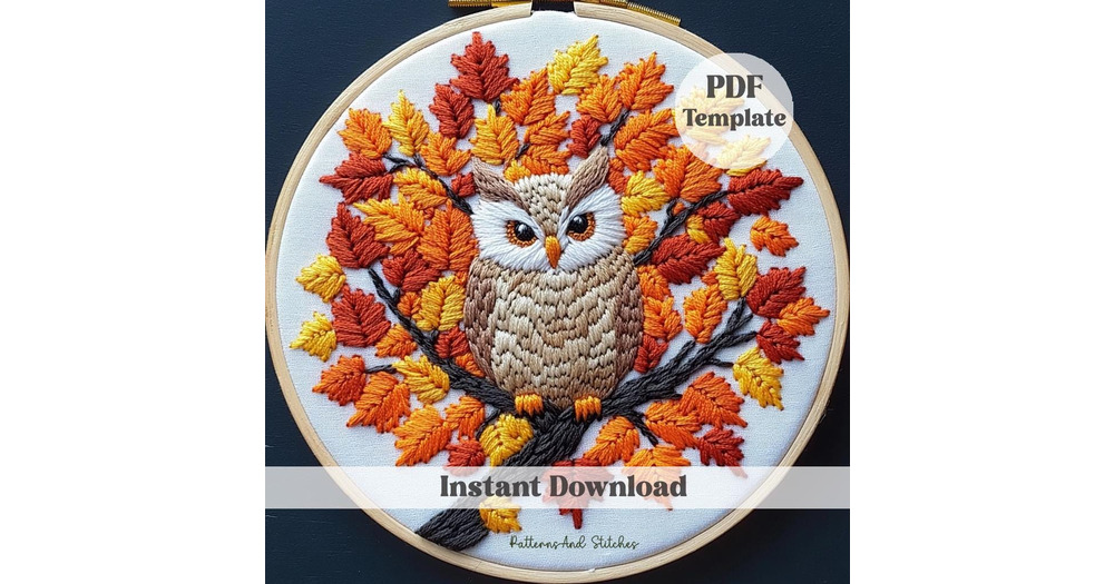 Autumn Owl Embroidery Pattern: Fall Leaves Needlework, wall decor(PDF Pattern)