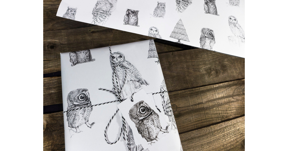 Luxury Owls eco wrapping paper - Hand drawn artwork on 100%recycled thick paper, 50x70cm