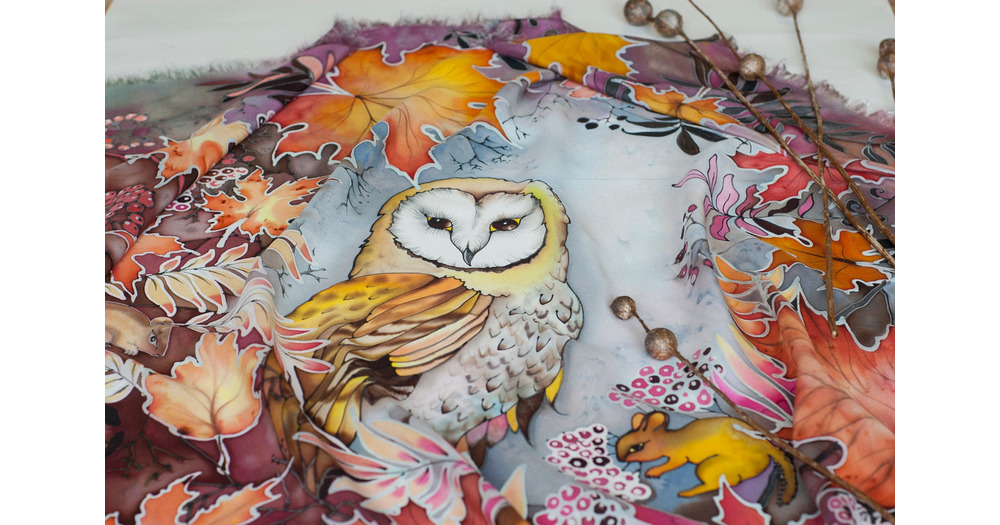 Hand painted scarf, silk scarf, barn owl, chipmunks, maple leaves, fall colors