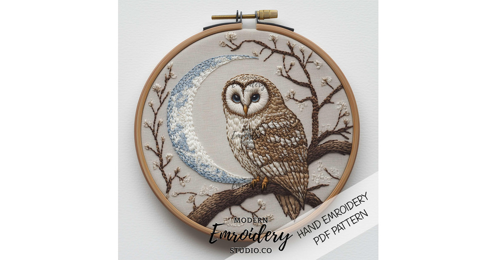 Owl and Moon Embroidery Pattern | Celestial Hand Embroidery PDF | Woodland Hoop Art for DIY Needlewo