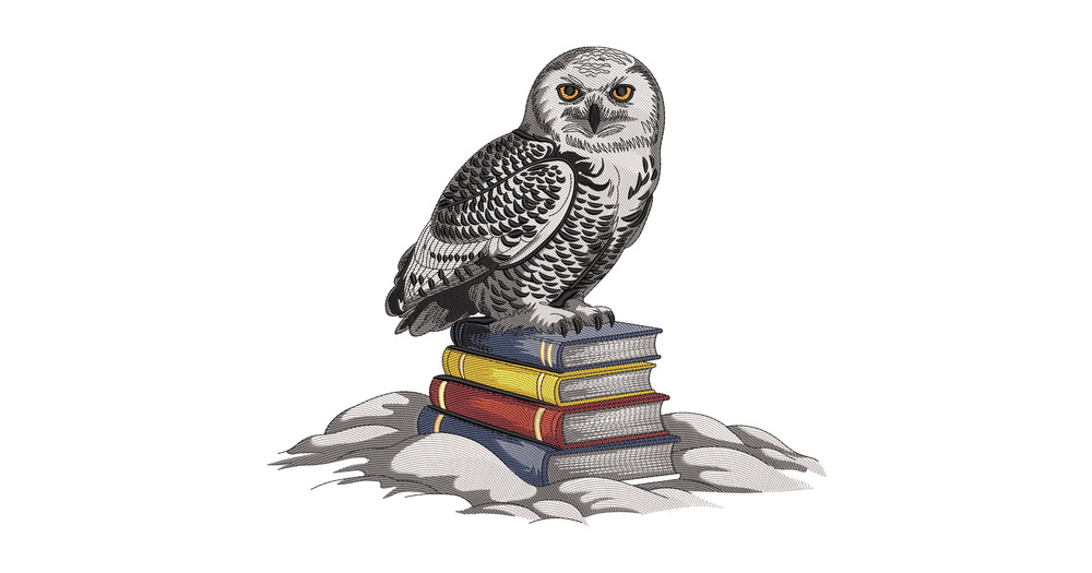Snowy Owl on Books Embroidery Design: Stack of Book Winter Scholar Machine Embroidery File