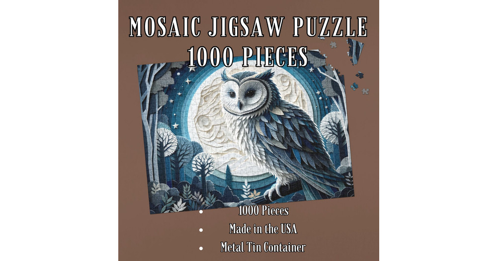 Meditative Mosaic Owl in Moonlit Forest, Paper Mosaic Puzzle, 1000 Pieces, Peaceful Forest Puzzle, C