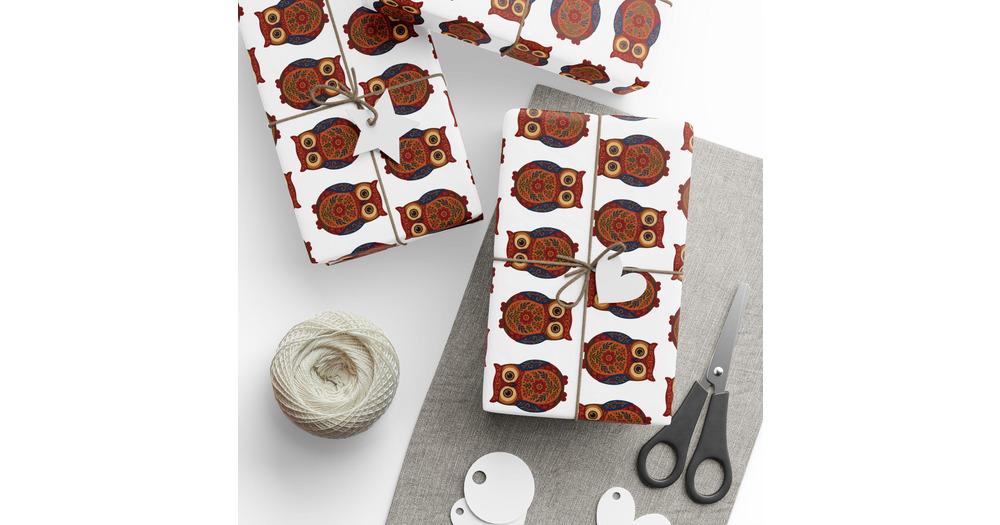 Folk Art Owl Gift Wrap - Festive Holiday Decorative Paper, Nature Lover Present Packaging, Unique Cr