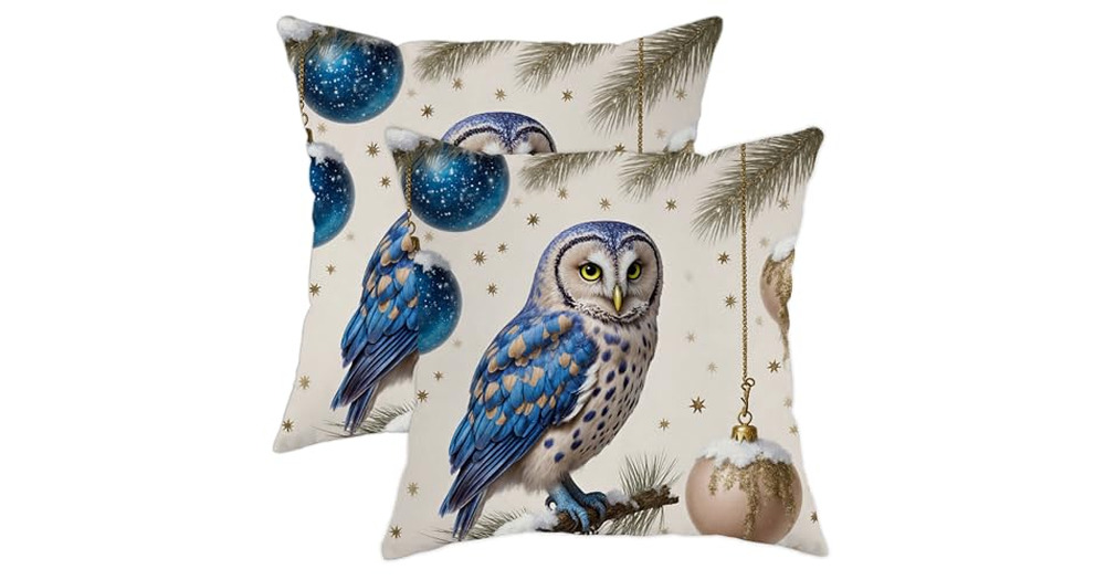 Owl Throw Pillow Covers Set of 2, Winter Fanciful Christmas Ornament Pine Branch Christmas Blue with