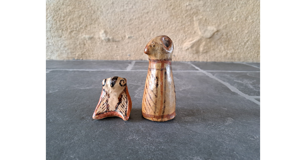 Set of 2 Antique small owl figurines, Vintage handmade Hand Painted Stoneware folk art souvenir Hand