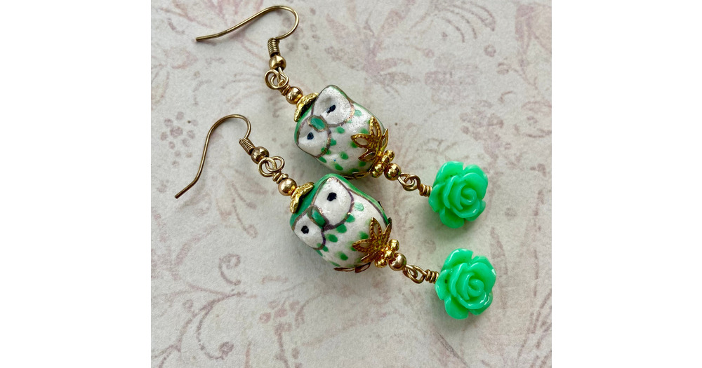 Ceramic Owl Earrings: Green Rose Accent, Gold Plated Hooks