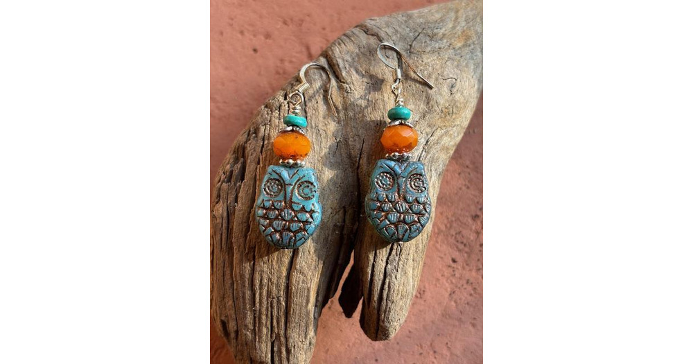 Blue Czech glass bead owl earrings with orange and blue accent beads, silver hypoallergenic earring