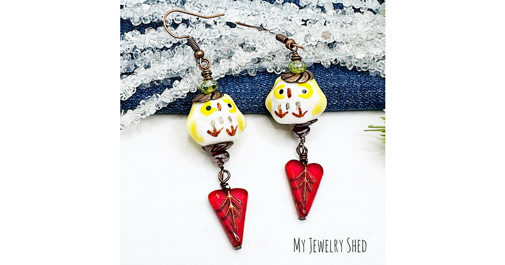 Cottagecore Woodland Owl Earrings, Czech Glass Hearts