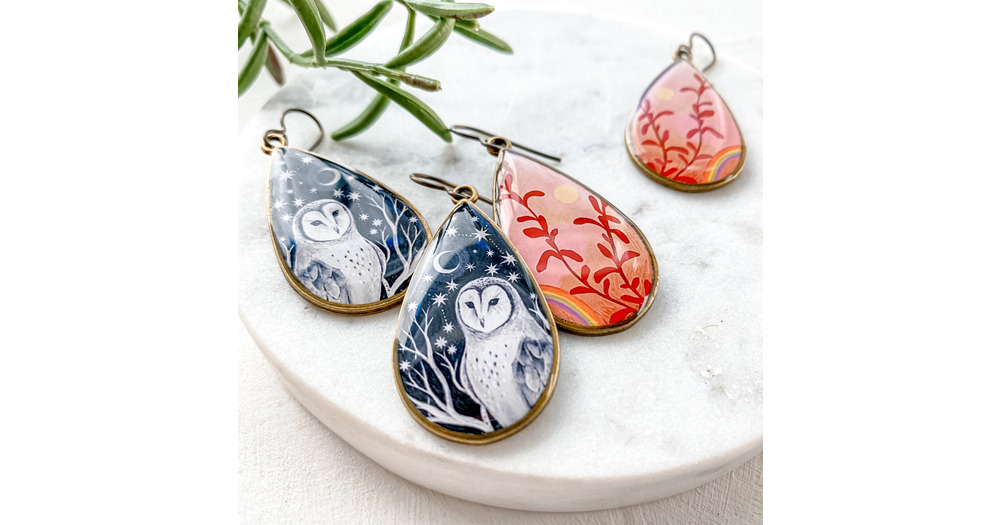Barn owl teardrop statement earrings, Large black and white art jewelry