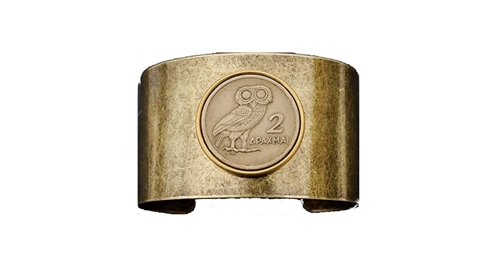 1973 Greece 2 Drachma Athena's Owl & Phoenix Coin Solid Brass Antique Finish Cuff Bracelet