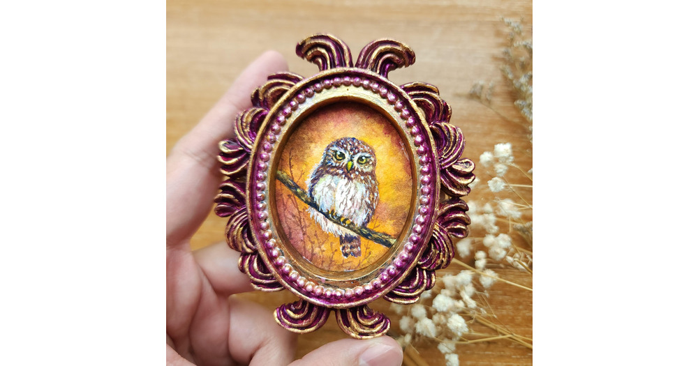 Mini Owl Original Watercolor in Hand-Painted Baroque Frame – Warm Golden Woodland Art –