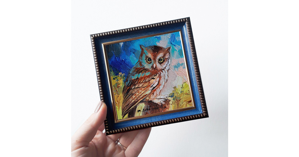 Owl bird painting original 4x4 inch small artwork framed, Bird owl wall art Best friend gift for wom