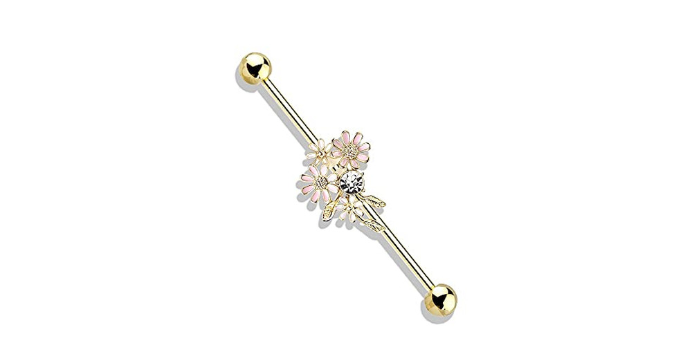 Pierced Owl 14GA Stainless Steel CZ Crystal and Enamel Flower Bouquet Industrial Barbell (Gold Tone)