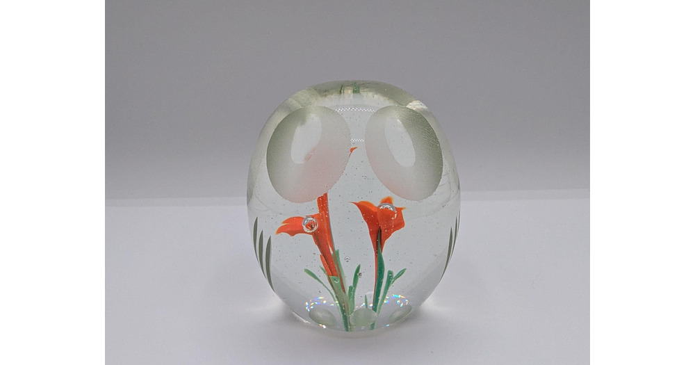 Vintage Etched Owl Handblown Paperweight - Clear and Orange Flowers Minimalist