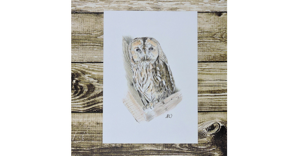 Tawny Owl Original Drawing; Colored Pencil Owl Decor; Small Bird Picture, Strix Aluco.