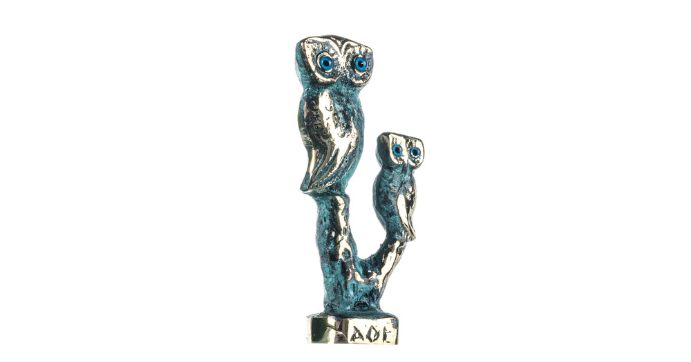 Set Owls of Athens Wisdom Solid Bronze Green-Gold Handmade 4.1 Inches