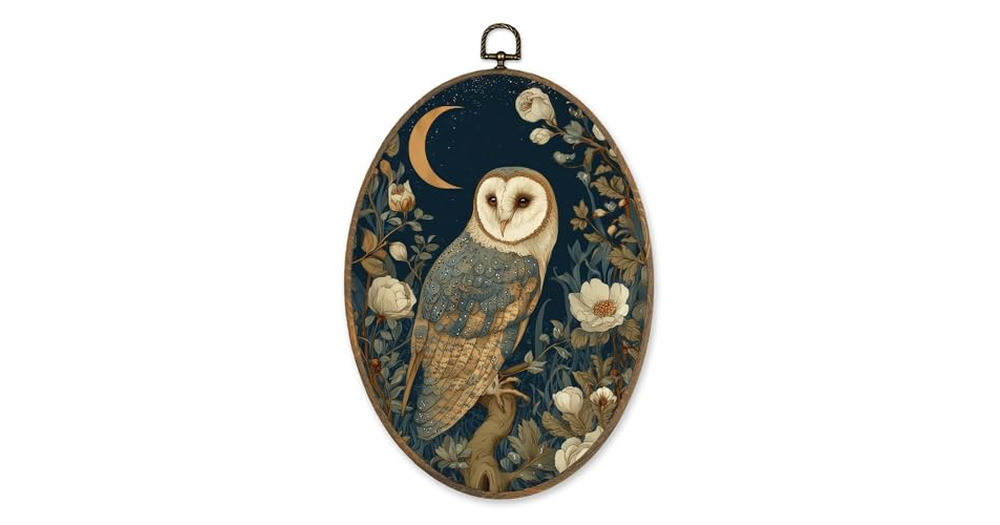 LKETW Vintage Owl Floral Oval Wall Art Decor, Rustic Cottagecore Bird Oval Canvas Hanging Decor, Dar