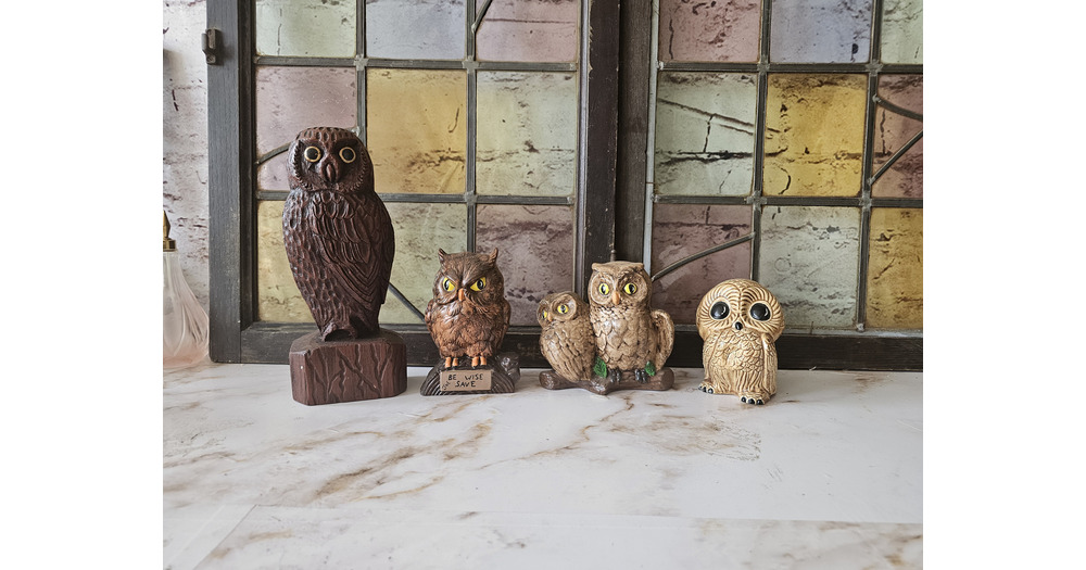 Vintage 70’s Owl Figurines Set 4 Ceramic and Wood Kitsch Decor