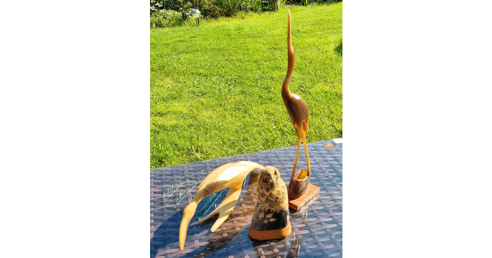 3x Vintage Buffalo Horn Sculpture, Owl Birds, Canadian Design Heron Crane Figure.  Owl, app 14cms,