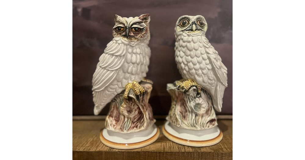 Vintage Hand-Painted PAIR of OWLS Figurine Statue Majolica ITALY Art Pottery 10"