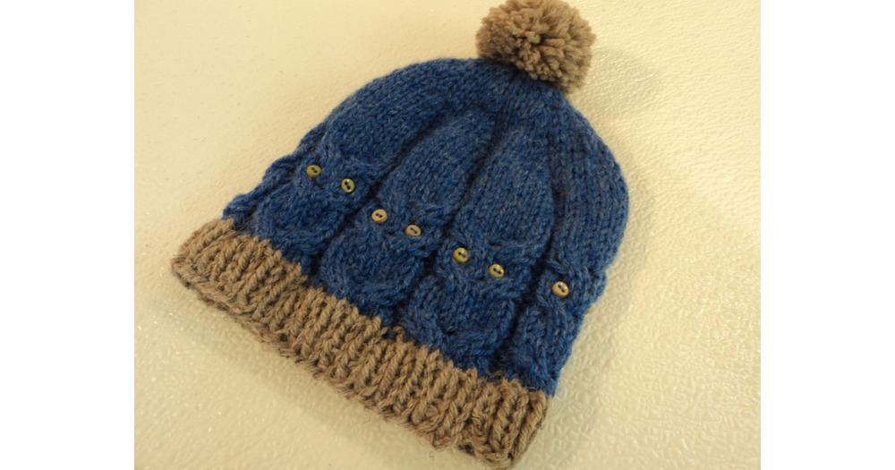 Handcrafted Knitted Baby Hat Blue/Gray Owl Pom Pom 100% Wool Male 9-12 months