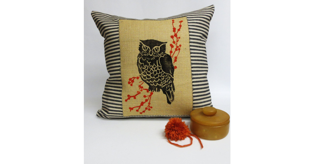 Owl Throw Pillow: Black Block Print, Rustic Burlap Cushion