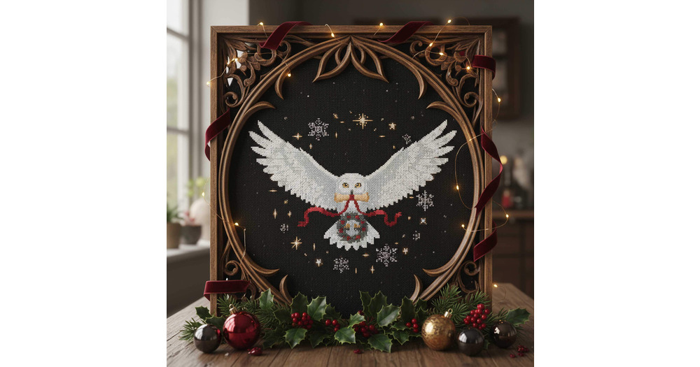 Snowy Owl Cross Stitch Pattern: Christmas Winter Embroidery with Wreath, Stars Snowflakes (PDF Patte