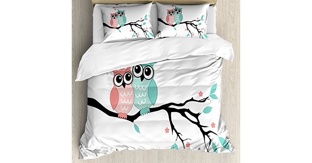 Ambesonne Teal and White Duvet Cover Set, Owl Couple Sitting on Tree Branch Valentines Romance Love,