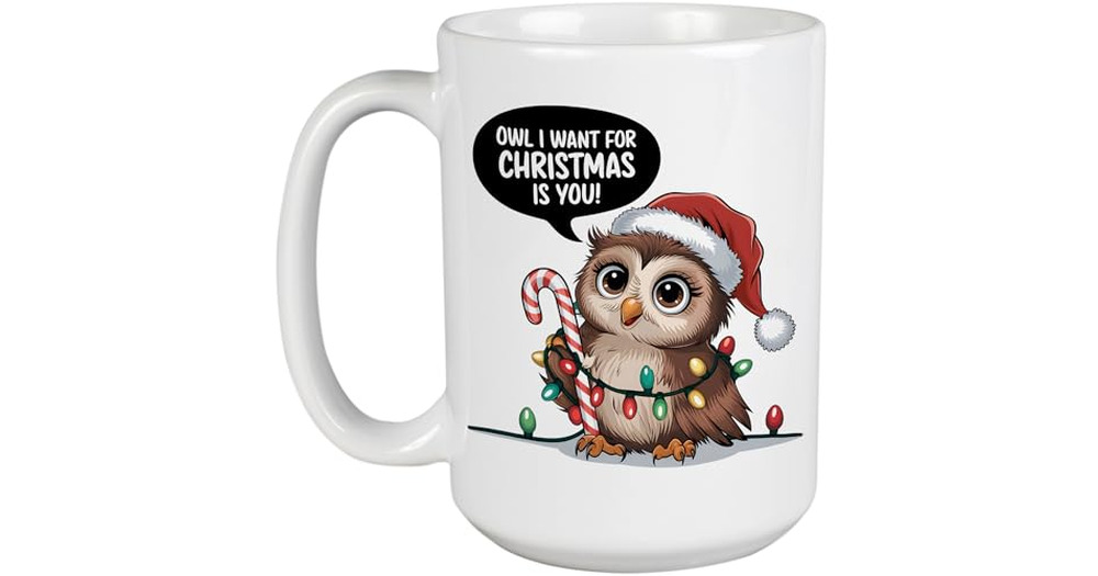 Make Your Mark Design Cute Christmas Owl Mug, Funny Owl Mug with Festive Lights, Holiday Coffee Cup,