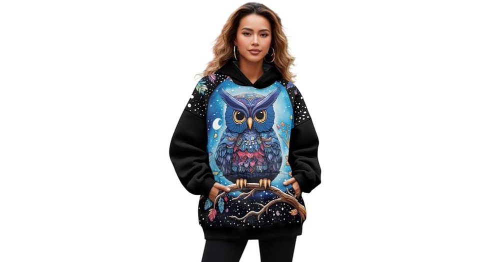 Showudesigns Owl Long Sleeve Hoodies for Women Oversized Graphic Sweatshirts Trendy Fall Fleece Pull