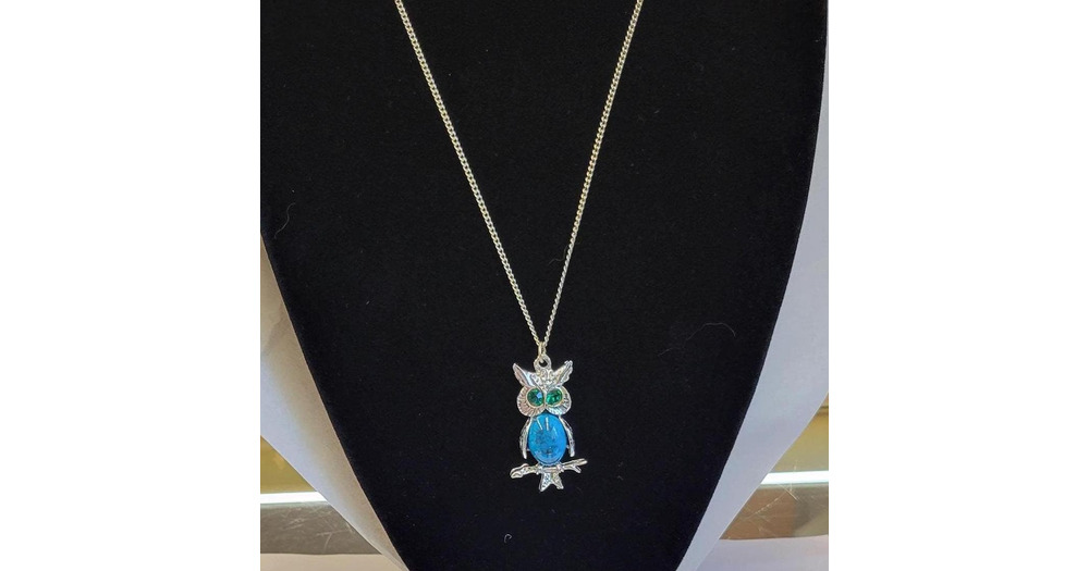 Vintage Faux Turquoise and Rhinestone Owl Necklace - Silver Tone Owl Necklace with Sparkling Green R
