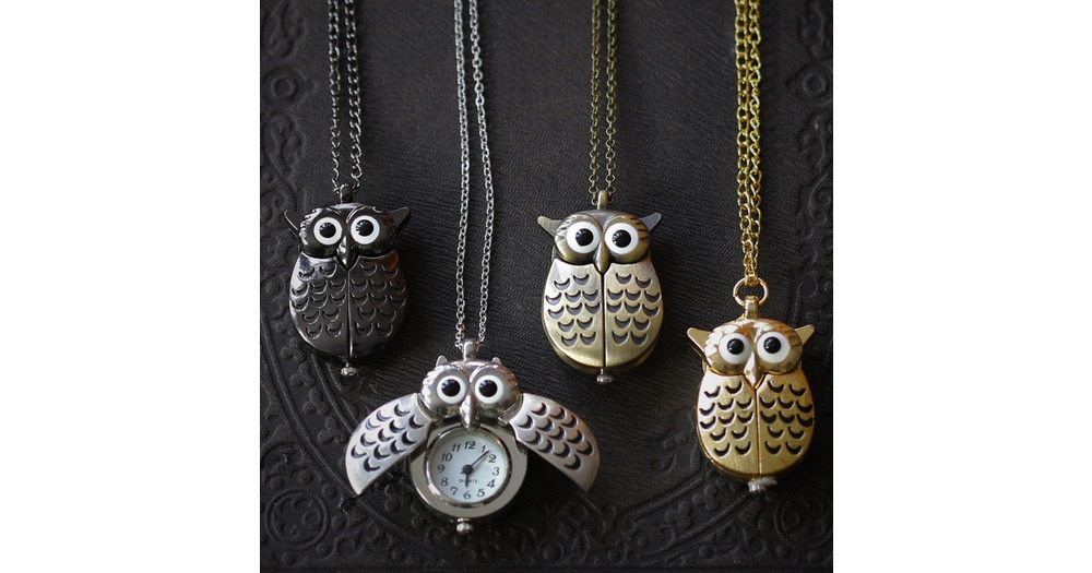 Owl Watch Necklace with Wings That Open to Reveal Working Timepiece - Choose Gold, Brass, Gunmetal o