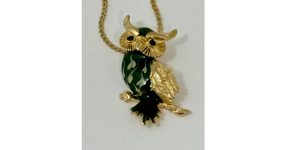 Green Enamel Owl Pendant Necklace - Gold Tone Bird Jewelry