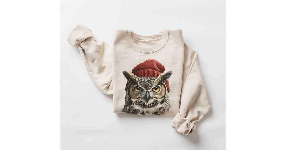 Retro Great Horned Owl Wearing Beanie Vintage Birding Birdwatching Unisex Sweatshirt