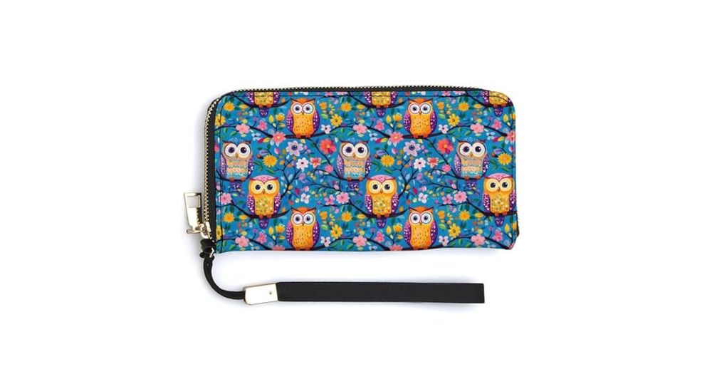 Leather Wristlet Wallets for Women - Flower Owl Print Small Hand Purse Ladies Wallet with Zipper