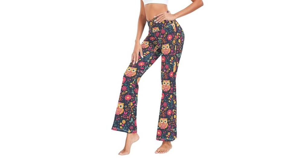 CHIFIGNO Cute Owls Colorful Flowers Womens Flared Leggings Bootcut Leggings Pants Trousers Crossover