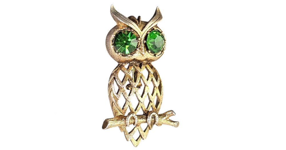 Vintage Roma Owl Brooch Green Eyes Gold Plate Costume Pin  2.25"